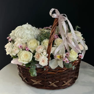 Эта уникальная композиция объединяет в себе изящество и роскошь, создавая неповторимое впечатление. Кустовые розы добавляют грациозности и элегантности, одноголовые розы играют крупными лепестками в гармонии с весьма нежными гортензиями. Орхидея же, своей изящностью, завершает эту потрясающую симфонию красоты в великолепной корзине.